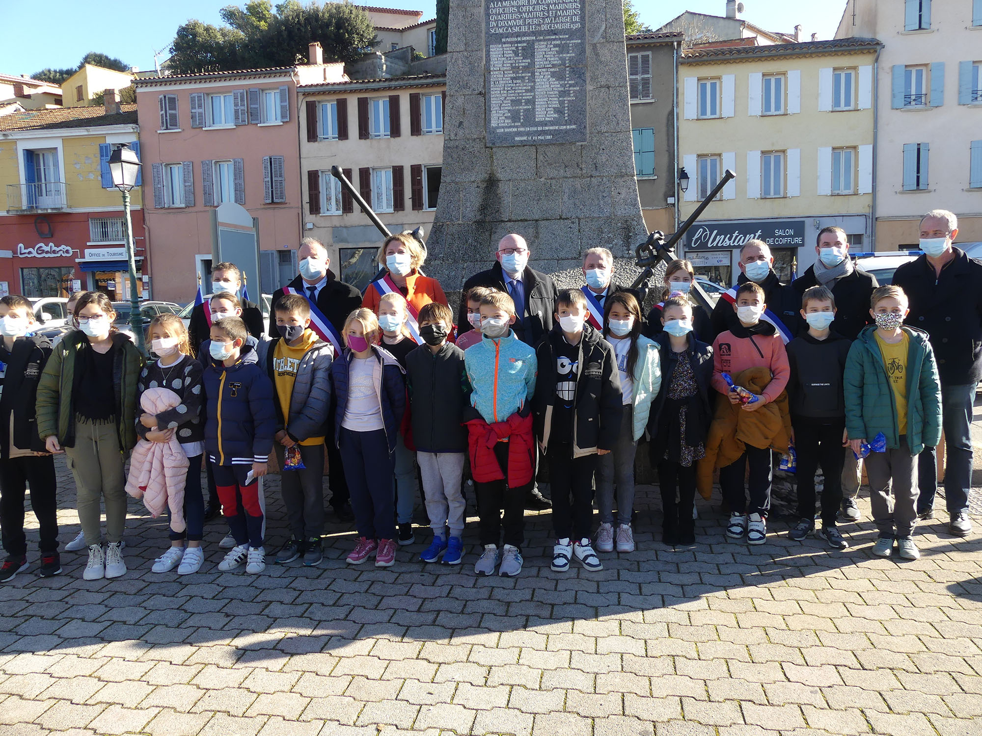 Après la messe célébrée en l’église Saint-Jacques-le Majeur, les élus de Pierrefeu et des communes voisines, les autorités civiles et militaires, les membres des associations patriotiques, les élèves de l’école Anatole France (classe CM2 de Monsieur SENE), la population ainsi que les élus du Conseil Municipal des Jeunes, se retrouvaient en cortège, accompagnés du son de la cornemuse jusqu’au-devant du monument du Dixmude pour le déroulement de la cérémonie du souvenir.