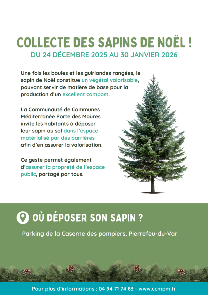 Jusqu'au 30 janvier 2026, la communauté de Communes Méditerranée Porte des Maures invite les habitants à déposer leur sapin et leurs cartons d'emballage dans les lieux matérialisés par des barrières au parking des pompiers, afin de les valoriser et d’assurer la propreté de l’espace public.