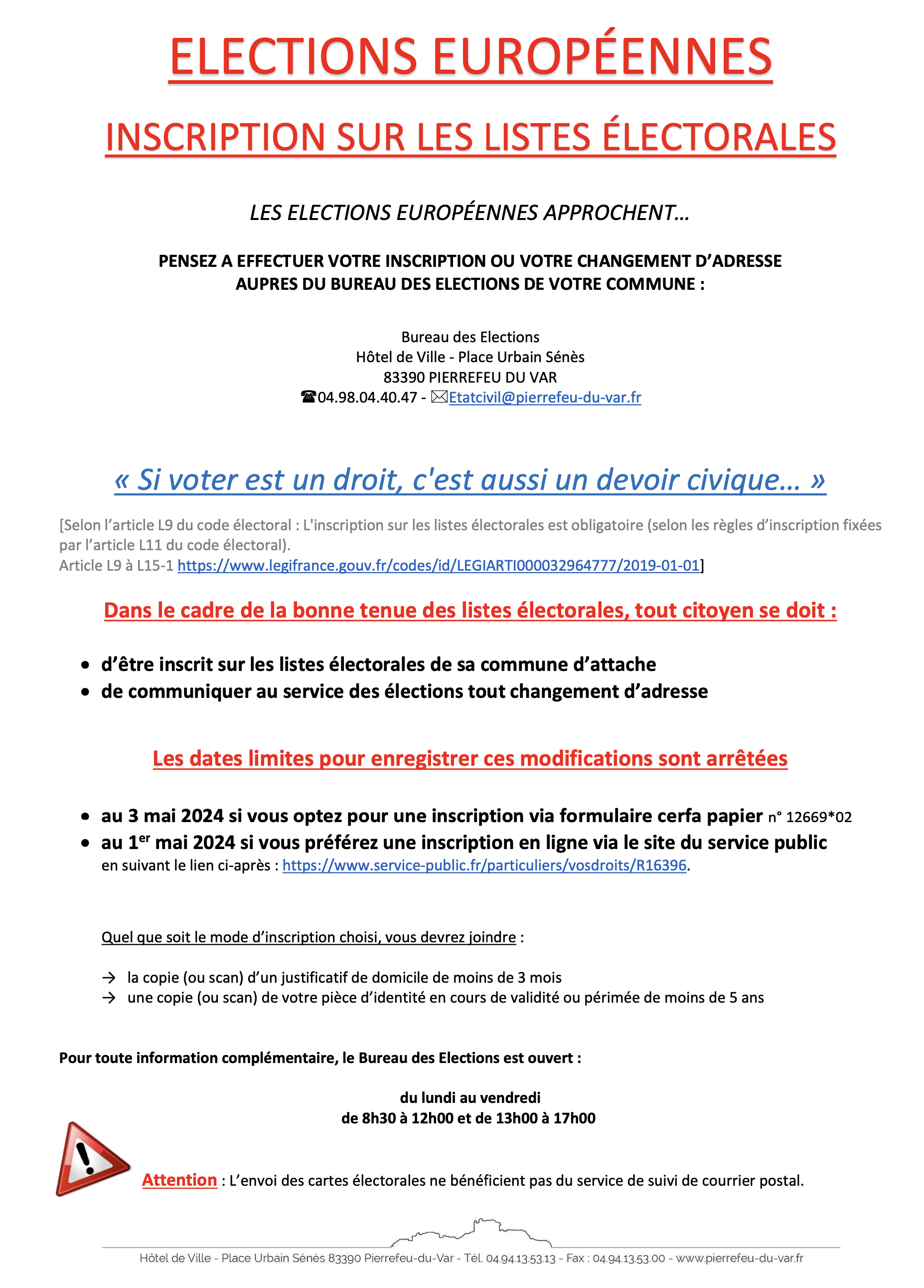 Les élections européennes approchent, pensez à effectuer votre inscription ou votre changement d'adresse auprès du bureau des élections de votre commune.