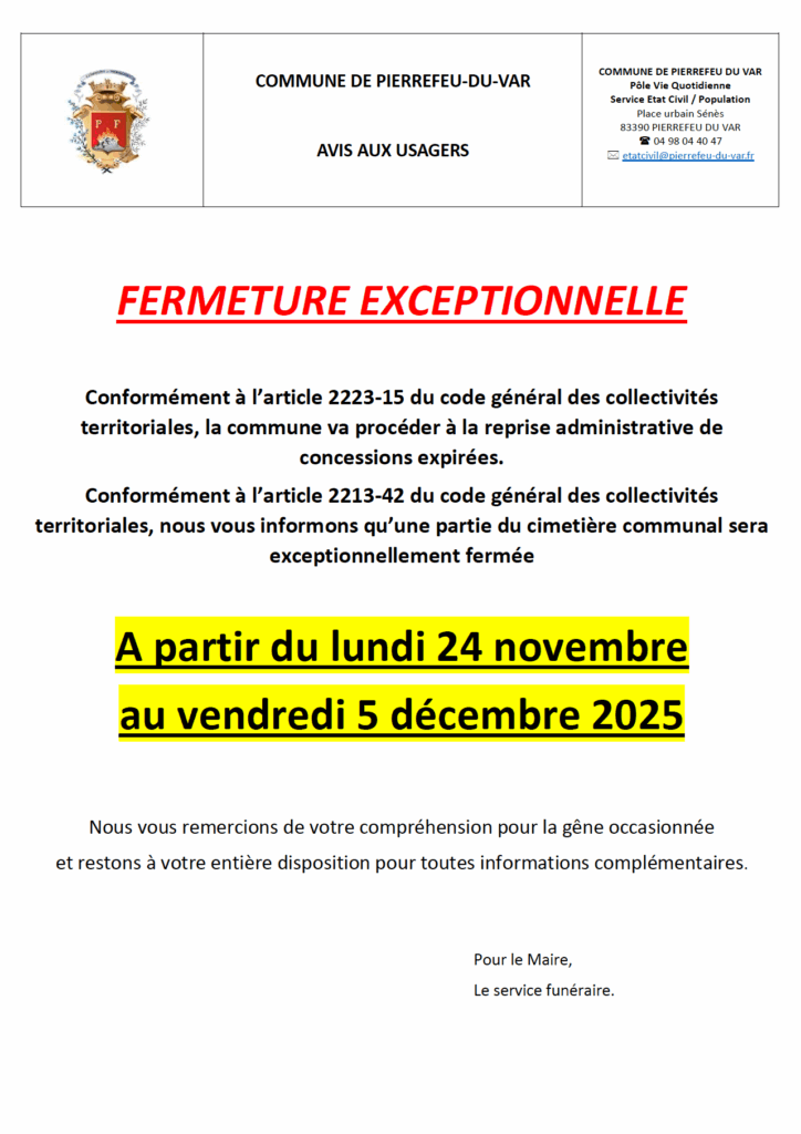 Fermeture d’une partie du cimetière du 24 novembre au 5 décembre