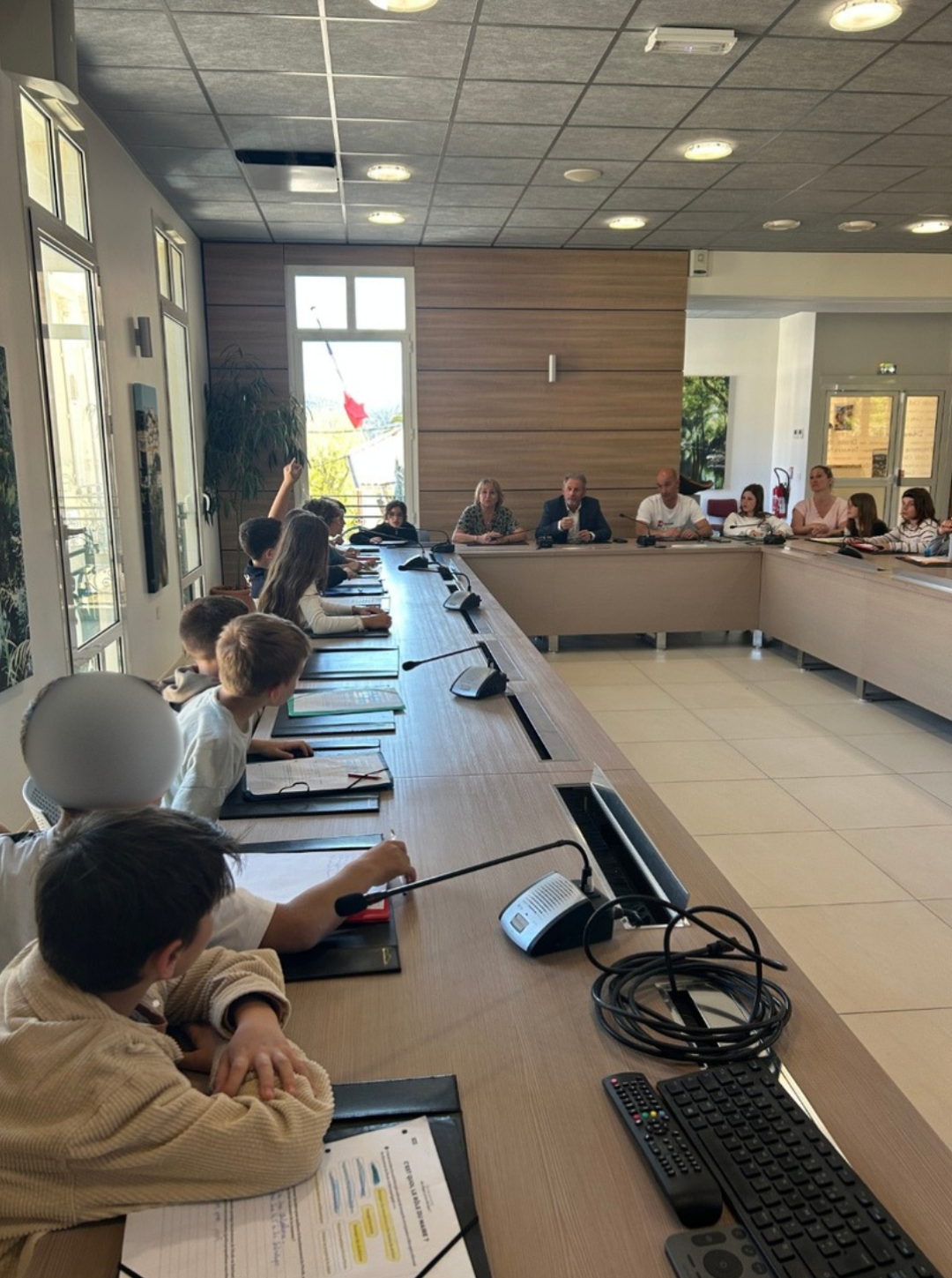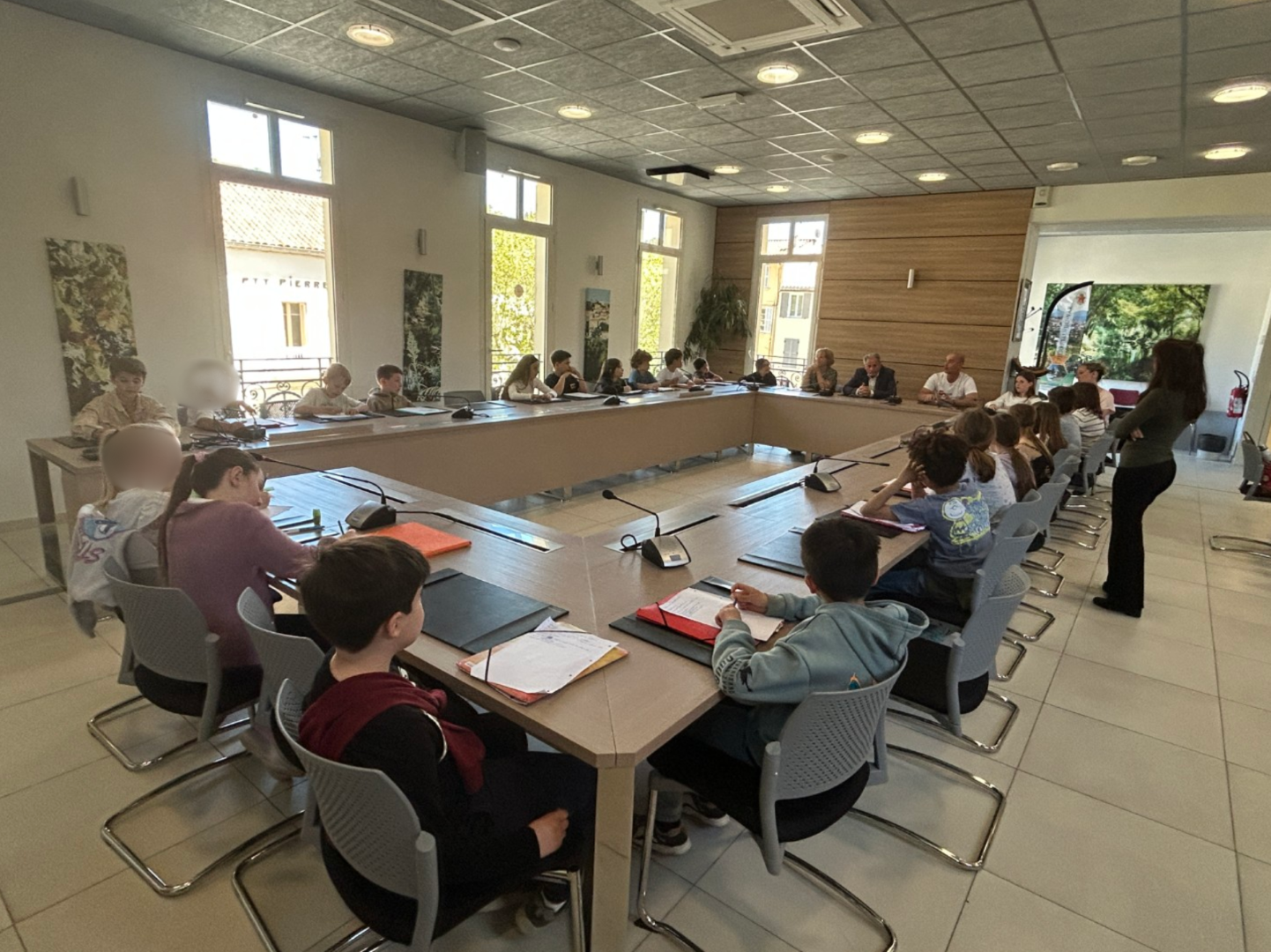 La classe de CE2-CM1 de Mme Borel a eu l’opportunité de visiter la salle du conseil municipal de Pierrefeu le 7 avril 2026, à la rencontre du maire.