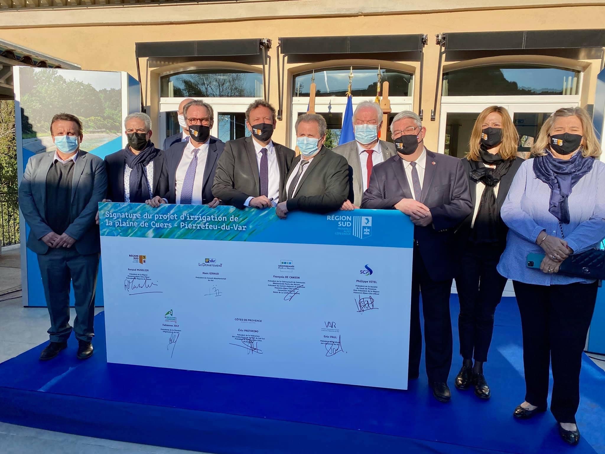 Lundi 22 mars, les principaux partenaires financiers au projet d’irrigation par le canal de Provence de la plaine de Cuers et de Pierrefeu se sont réunis en la maison des vins des Appellations des Côtes de Provence, sur la commune des Arcs, pour la signature officielle d’un contrat de partenariat.