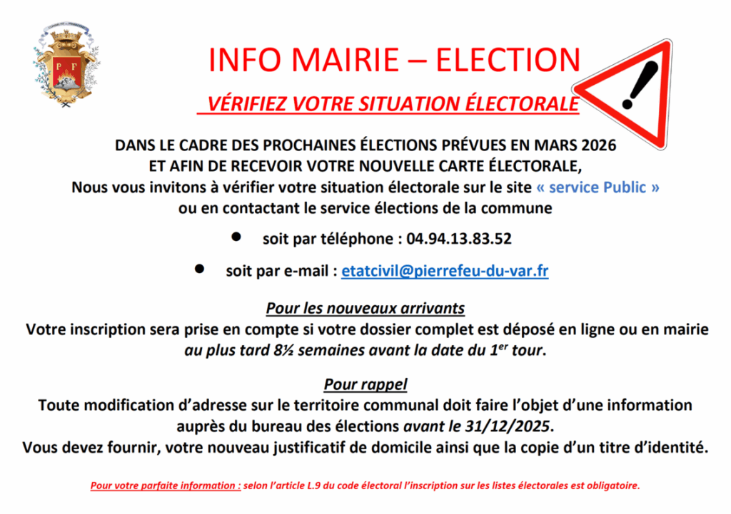 Dans le cadre des prochaines élections prévues en mars 2026 et afin de recevoir votre nouvelle carte électorale, nous vous invitons à vérifier votre situation électorale sur le site « service Public » ou en contactant le service élections de la commune